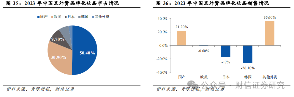 据青眼资讯发布的《2023年中国化妆品年鉴》统计显示,截至2023年年末,外资品牌仍占据了我国化妆品市场近五成的市场份额,远高于法国、美国、日本等国化妆品行业外资企业的市场份额。虽然外资品牌具备先发优势,但近年来外资品牌增长明显乏力。据青眼情报数据显示,2023年线上渠道美妆类目TOP20品牌增速来看,国货品牌同比为24%,而外资品牌则同比下滑0.9%。我们猜测主要为两方面原因,一方面,由于外资品牌产品创新速度慢,“本土化”进展缓慢,再叠加线上线下群渠道运营缺乏敏锐反应度,使得其逐步丧失了先发优势。另一方面则是受地缘政治事件影响。据未来迹统计,2023年前三季度,资生堂同比增长3.6%,但受日本排泄核污水事件影响,Q3出现负增长。LG生活健康、爱茉莉太平洋亚洲市场2023年前三季度业绩同比下滑14.9%和13%。后续来看,随着消费持续复苏,消费意愿进一步回升,具备高性价的国货品牌或将加速崛起,持续抢占外资品牌释放的市场空间。