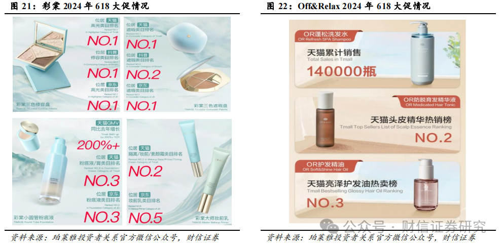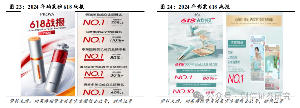 大单品战略延续,产品矩阵丰富。彩棠创立于2014年,由专业明星化妆师唐毅先生创立。品牌意在以现代视角传递中国美学,秉持着中国妆、原生美的品牌理念,助力每一位女性以妆容表达自我,展现自身独一无二的灵动与光彩。2019年,品牌被珀莱雅收购。目前,彩棠品牌已推出了青瓷、苏绣、青瓷海棠、争青等多个系列,涵盖了修容、遮瑕、高光、腮红、妆前乳等多个细分品类,主要发力150-300元价格区间。其中,三色修容盘、双色高光盘、大师妆前乳、三色遮瑕盘已成为品牌的核心大单品,稳居细分品类前列。2023年度,彩棠品牌营收突破10亿元,营收占比为11.21%,已成为公司第二增长极。此外,2024年618大促期间,彩棠品牌获得天猫平台彩妆类目第一,同比增长80%+;抖音平台彩妆类目第九。未来,彩棠还将重点发力底妆赛道,为品牌增长持续蓄能。