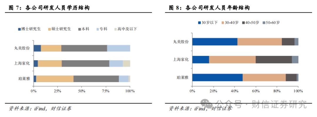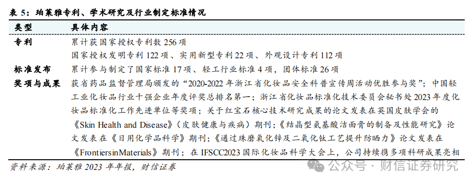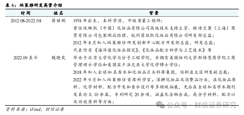公司以自主研发为主、产学研相结合为辅的研发模式,并持续完善基础研究、配方开发、原料等多个环节的研发布局。战略合作上,公司对内与浙江大学、浙江工业大学、杭州电子科技大学、江南大学、北京工商大学等前端研究机构积极开展产学研融合项目;对外与巴斯夫中国、亚什兰中国、帝斯曼上海、西班牙LIPOTRUE,S.L.、禾大中国等优秀原料供应商达成了战略合作。据珀莱雅官方账号显示,与珀莱雅达成合作的国际优质原料供应商已涵盖了欧美、日本等20多个国家和地区的100多个品牌;研发团队建设上,公司通过博士后研究站、国家级人才引进等方式打造了专业的研发团队。2022年,曾任职科蒂集团亚太研发总监魏晓岚女士也加入了珀莱雅研发团队。据公司2023年年报显示,公司研发团队已超过300人,研发人员占比为10.84%,远超行业平均水平。其中,硕士研究生及以上学历为134人,占研发团队41.61%,居行业前列。此外,继科学护肤研究室、国际科学研究院和珀莱雅检测中心后,公司杭州龙坞研发中心和上海研发中心也于2023年已正式投入使用,后续将持续专注皮肤肌理研究、活性物设计及功效验证等各个方面的研究和开发;研发策略上,公司已构建了以消费者需求为核心迭代的研发闭环,使产品为营销服务,在产品概念设计和策划阶段,就为未来营销植入“话题性”和“营销思路”,有助于在更好贴合消费者需求的同时进行营销推广。