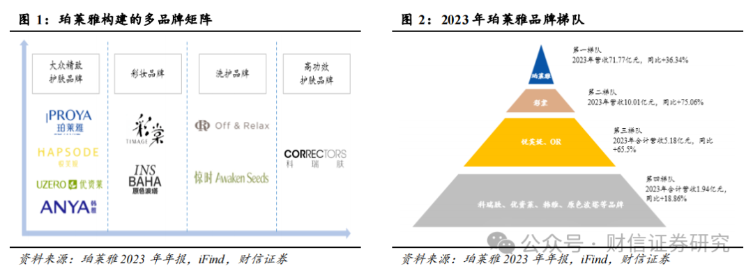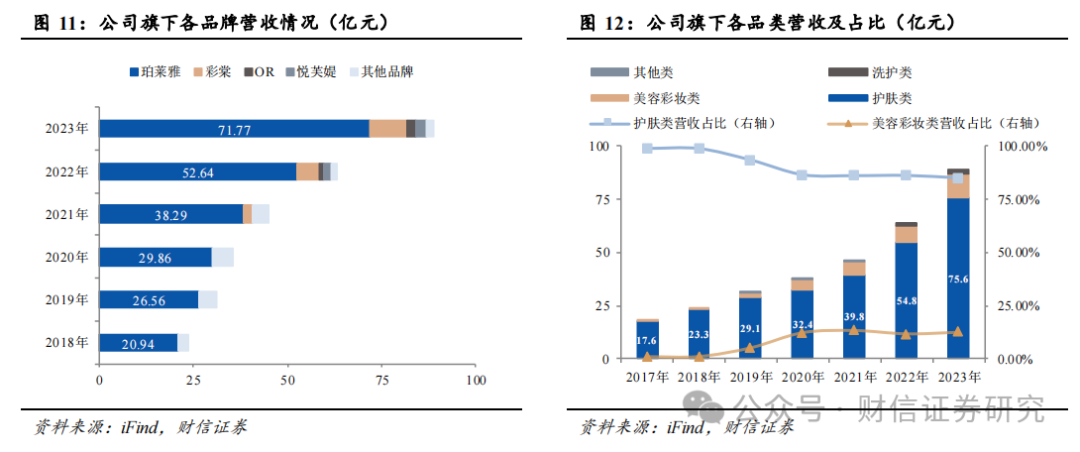 公司未来看点:产品端:大单品持续迭代夯实规模基本盘,多元布局打开成长上限。1)参考海外国际大单品超10年以上的生命周期,珀莱雅品牌核心大单品自推出至今均不到5年,再叠加产品持续进行纵向迭代升级和横向衍生,珀莱雅品牌成长空间广阔。目前,珀莱雅红宝石、双抗、源力、能量四大系列均延伸出了水、乳、眼霜、面霜等多个细分品类,大单品的带动效应进一步放大,量增趋势显著。2)相较于单一品牌在市场波动或竞争加剧所面临的风险,多品牌发展的模式不仅能分散风险,还能提高企业的稳定性。公司搭建了珀莱雅为主,彩棠、off relax、悦芙媞等品牌在内的多品牌矩阵,进一步提升了抗风险能力。其中,子品牌彩棠2023年营收为10.01亿元,同比增长75%,营收占比提升至11.21%,已成为公司第二增长极。此外,其他品牌增长势头也较为强劲。营销端:以消费者为核心,成功运营方法论有望持续复制。在珀莱雅二十周年战略发布会上,总经理方玉友再次强调了“6*N”的长期战略。其中,区别于之前“话题性产品+头部KOL炒作+不断圈层扩张”的营销模式,新策略一切以消费者为核心进行业务规划,并事先针对消费者需求进行产品开发和研发体系搭建。而红宝石面霜推广的大获成功也就非常好的验证这个策略的成功。此外,珀莱雅现在目标客群为一线、新一线及二线城市的新锐白领和Z世代为主。公司也更注重提升品牌在年轻消费者群体中的曝光度和影响力。整体而言,我们认为随着年轻人群成为国内护肤品消费的主体,消费行为不断改变,年轻化的品牌定位,以及已被验证可行运营方法论或将为品牌抢占先发优势,从而为品牌持续增长打下坚实基础。
