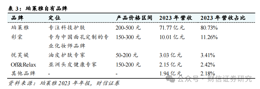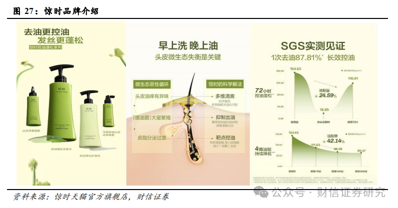 率先布局洗护赛道,差异化定位头皮护理。Off Relax是由曾经在宝洁美国和日本研发中心担任潘婷、滋源、海飞丝等产品首席研发的杨建中博士于2020年创立。品牌以“治愈头发、疗愈情绪”为初衷,净化从发肤直至身心,致力于为亚洲人定制不同的头皮养护方案。2021年6月,品牌被珀莱雅收购,并在中国大陆正式上市。秉承珀莱雅公司的大单品战略,Off Relax自上市以来,成功打造了“清爽蓬松洗发水”和“轻盈发膜”等明星产品。目前,品牌产品线丰富,推出了头皮预洗产品、洗发水、护发素、发膜、头皮精华和护发精油等多个细分品类,价格区间为150-200元。据公司年报显示,2023年,Off Relax实现营收2.15亿元,同比增长71.17%,营收占比提升至2.42%。此外,今年5月,公司还推出了专研头皮微生态的功效洗护品牌-惊时AwakenSeeds,与Off Relax形成了差异化的市场定位和产品特色,有助于满足不同消费群体的需求。综合而言,惊时品牌的推出,进一步丰富了珀莱雅的洗护多品牌、多品类的发展布局。