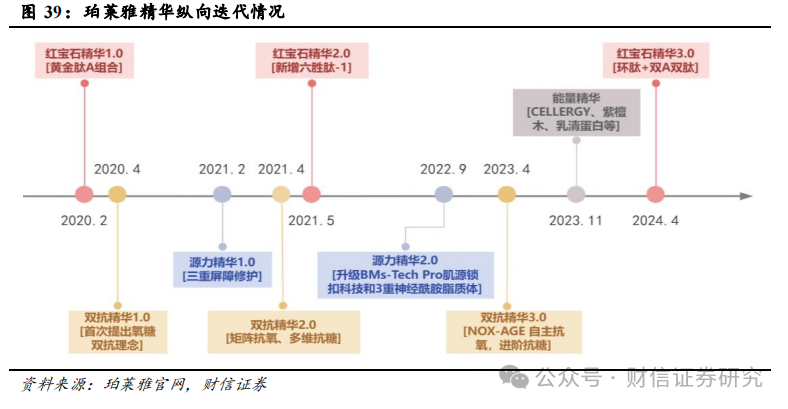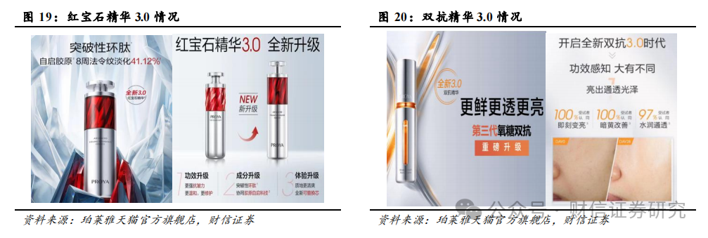 整体而言,纵向迭代方面,珀莱雅核心大单品红宝石、双抗精华均全方位升级至3.0版本,源力精华升级至2.0版本。其中,红宝石精华3.0添加了中国美妆首款专利环肽新原料“环肽-161”。升级后的肽A体系协同功效放大器水飞蓟素,能直接激活促生胶原的关键信号通路TGF-β,深入真皮层抗老,精准攻克顽固深纹。据珀莱雅天猫旗舰店显示,经权威第三方机构SGS检测,红宝石精华3.0可以做到四周淡化八大纹路。相较于双抗2.0采用以麦角硫因、EUK-134、Lipochroman-6脱羧肌肽、Collrepair为主要成分的氧糖双抗配方矩阵,双抗精华3.0特别添加了独家氧糖双抗新成分Nox-Age,不仅能提升143.52%自身抗氧力,还能减少82.47%的蛋白质氧化损伤(抗羰基化),从而使肌肤问题得到快速修复。另外,据陕西博溪通用检测科技有限公司检测报告显示,高纯度的麦角硫因Max能达到1小时渗透肌肤,实现高能抗氧。横向衍生方面,珀莱雅四大系列产品矩阵系列由点及面,不断扩展衍生,目前已从精华扩展至眼霜、面膜、面霜、水等各个品类。