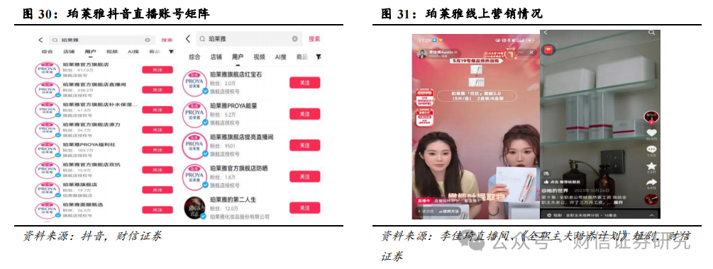 线上渠道分拆来看,珀莱雅的线上渠道主要分为直营和分销两种模式运营。其中,直营以天猫、抖音、京东、快手、拼多多等平台为主,分销则包括了淘宝、京东、唯品会等平台。天猫端:2018年珀莱雅重组了天猫电商团队,布局了以天猫为主导的直营渠道,营收占比相对较高且相对稳定。2023年,公司持续深化大单品矩阵战略,优化货品和投放结构,核心品类排名及精细化运营效率不断提升。抖音端,珀莱雅通过抖音广告投放、设立抖音小店等方式迅速积累了知名度和曝光量。2019年,公司凭借“KOL种草+主播带货”的打法,成功打造了爆品“黑海盐泡泡面膜”。2020年,珀莱雅重点拓展抖音渠道电商业务,使得抖音渠道成为拉动品牌高速增长的重要引擎。2023年,公司通过在短剧《全职主夫培养计划》中设计了闭环链路实现流量变现。截至2024年6月末,珀莱雅建立了13个品牌直营账号,每个账号侧重的推广不同,其中,红宝石系列、双抗系列、源力系列、能量系列,以及防晒系列均开设了单独账号,其余账号则针对全品类产品推广,公司投放结构进一步得到优化,效率不断提升。