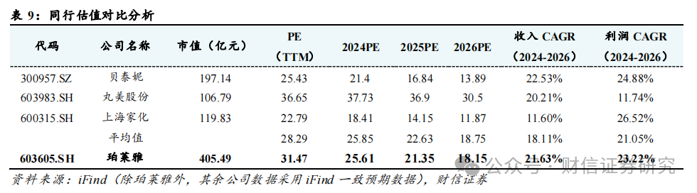 基于上述关键假设,2024-2026年,预计公司实现净利润15.83/18.99/22.34亿元,EPS分别为3.99/4.79/5.63元,当前股价对应的PE分别为25.61/21.35/18.15倍,考虑到:1)2024年,公司营收增速预计在20%以上,利润增速预计在30%以上;2)根据iFind一致预期,截止2024年7月3日,可比公司贝泰妮、丸美股份、上海家化2024年业绩对应的PE分别为21.4、37.73、18.41倍,PE平均值为25.85倍;作为国货美妆龙头,珀莱雅战略规划清晰且具有前瞻性,多元化业务布局优势凸显、渠道和营销模式也更为成熟,我们给予公司2024年27-33倍PE估值,目标市值为427.43-506.58亿元,对应目标价为107.73-127.68元。维持公司“买入”评级。