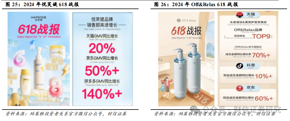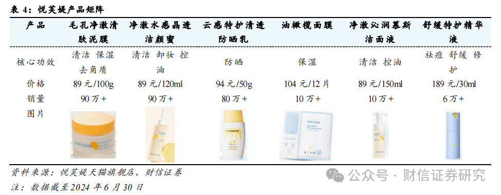 锚定油皮护理,持续填补大众中端护肤。悦芙媞创立于2015年,为珀莱雅与韩国团队联手打造的首个专为年轻肌肤定制的快乐美妆品牌,产品定位主要为“油皮护肤专家”。目前,品牌已形成了涵盖洁面、面膜、精华、防晒等多个品类的产品矩阵,主要发力50-200元价格区间。此外,在今年618大促期间,悦芙媞在天猫、京东、拼多多等平台增速亮眼,GMV同比分别增长20%、50%+、140%+。据公司年报显示,2023年悦芙媞品牌实现营收3.03亿元,同比增长61.82%,营收占比提升至3.41%,后续有望持续提升。
