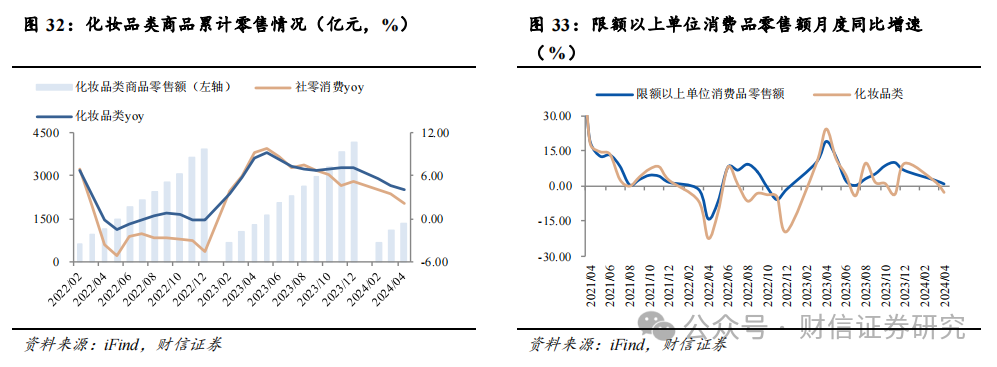 2024年以来化妆品大盘表现略弱于行业整体,行业正处于复苏阶段。2024年1-4月,化妆品类商品零售同比增长2.1%,表现低于同期社零大盘增速,我们猜测主要为三方面原因,一是受消费复苏放缓影响,作为可选消费的化妆品类受到一定程度抑制,整体表现不佳;二是2022年在疫情影响和企业竞争降价背景下,消费者手头库存积累较多,导致消费者当前依旧处于去库存阶段,购买力相对偏弱;三是受线上流量红利见顶,以及新营销模式兴起影响,单一渠道依赖较重,转型较慢的品牌暂时性承压。