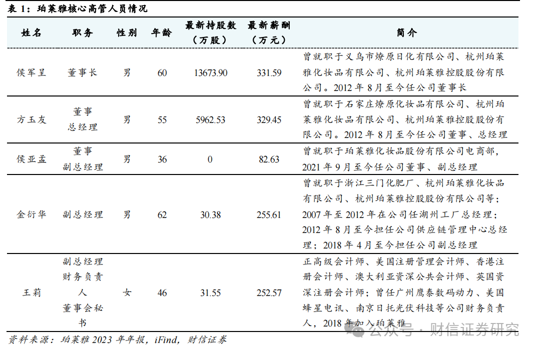 公司创始人侯军呈、方玉友先生专注化妆品行业近30年,早年更是通过化妆品经销起家,代理过羽西、丁家宜、小护士等多个国内本土品牌,对化妆品的运营模式、销售渠道、以及市场趋势有着深刻理解。此外,绝大多数核心管理层在公司任职时间较长,熟悉公司各板块业务,总经理方玉友至今仍直接管理着公司23个部门,躬身入局常年冲在市场一线。