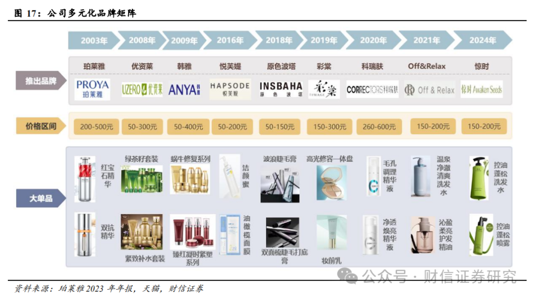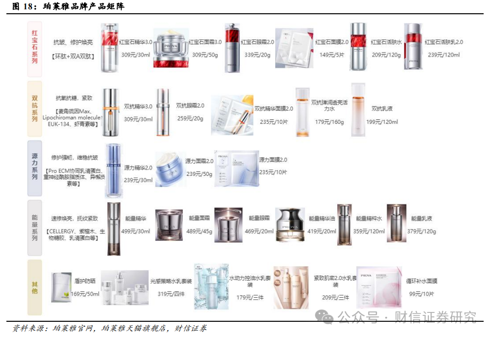 此外,我们在复盘雅诗兰黛经久不衰的大单品-小棕瓶的成长路径时发现,产品自1982推出至今已迭代至第七代,成分配方持续升级,产品生命周期不断延伸、价格中枢也不断上移。珀莱雅的三大核心单品,红宝石精华、双抗精华、源力精华目前已迭代至第三代、第三代和第二代。2023年11月,公司还推出了定位中高端的能量精华,产品价格再度进阶。综上所述,我们认为产品持续迭代升级,不仅能巩固其自身优势,还能根据市场变化优化配方,延长产品的生命周期。与此同时,升级迭代所伴随的价格中枢上移也将进一步支撑品牌长期发展。此外,珀莱雅品牌还通过大单品横向衍生形成产品矩阵,不断打开单一产品天花板。珀莱雅核心大单品红宝石、双抗、源力系列分别延伸出了水、乳、眼霜、面霜等多款产品,进一步放大了大单品带动效应,量增趋势显著。