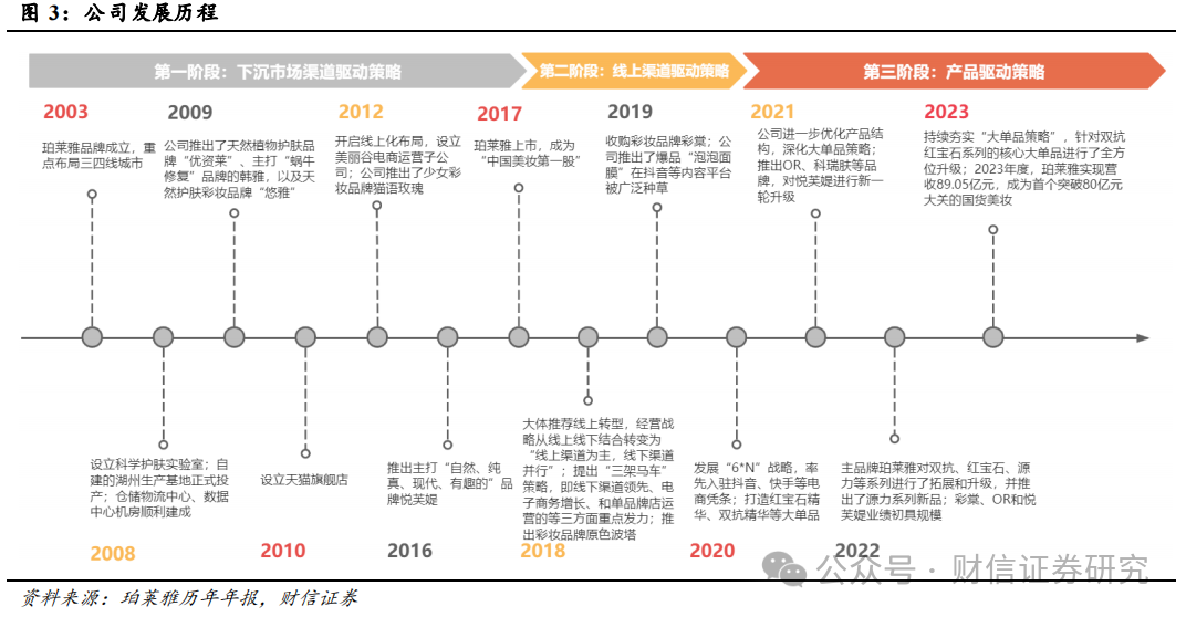 21世纪以来,我国化妆品行业发展经历了国货雏形初现的批发时代、国货品牌凭借线下CS红利崛起的渠道时代、以及依托线上平台逆势突围的新品牌时代的历次变革,市场竞争格局不断改变。其中,珀莱雅自2003年成立以来,通过精准市场定位、科研投入和多元渠道布局,跨越了一个又一个的生命周期,实现了逆袭增长。我们根据公司转型时间点以及转型的主要驱动力将公司发展分成三个阶段分别进行复盘。