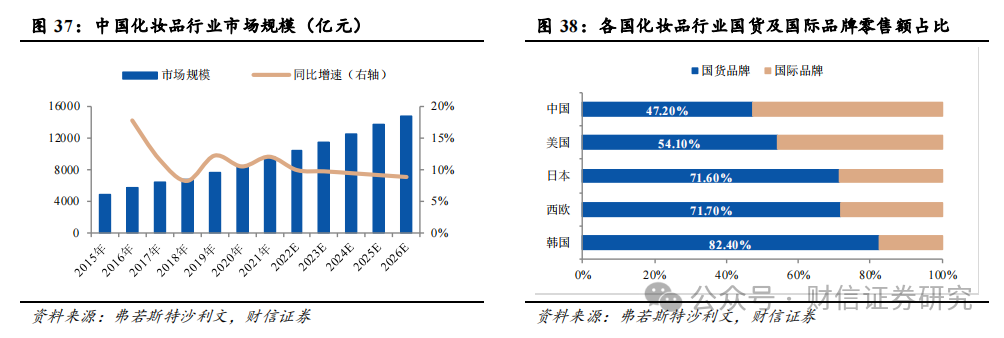 目前,我国为全球第二大化妆品消费市场,但较发达国家,人均化妆品消费量仍处低位。据Euromonitor和《2022年美妆原料与产品洞察报告》显示,2021我国人均化妆品消费约为62美元,与美国的310美元、韩国的266美元、日本263美元还存在差距。后续随着国民生活水平不断提高,消费结构持续优化,我国化妆品市场规模还有较大的提升空间。据弗若斯特沙利文报告显示,2015-2021年,我国化妆品市场规模由4801亿元增长至9468亿元,年复合增长率为12.6%,远高于全球化妆品市场同期2.2%的年复合增长率,市场仍处于快速扩张阶段。据弗若斯特沙利文预测,2026年我国化妆品市场规模将达到14822亿元,2022-2026年的年复合增长率预计为9.38%,我国化妆品市场或将继续保持快速增长。