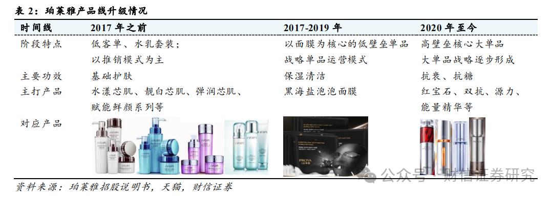 第三阶段(2020年至今)大单品策略品牌力共同驱动阶段。2020年,面对人口年龄结构变化、消费需求升级等新趋势,珀莱雅开启了第三次转型。公司提出了6*N战略,将原来渠道驱动策略转变为产品驱动策略,并提出要以科研能力为基础,通过大单品体系的升级持续对“品牌产能的功能价值和情绪价值”进行赋能。截至目前,公司已深度绑定了“早C晚A”概念,打造出了红宝石精华、双抗精华等核心大单品。此外,公司已经形成了以红宝石、双抗、源力和能量等四大系列为支撑的产品矩阵,公司产品力和品牌力持续向上。