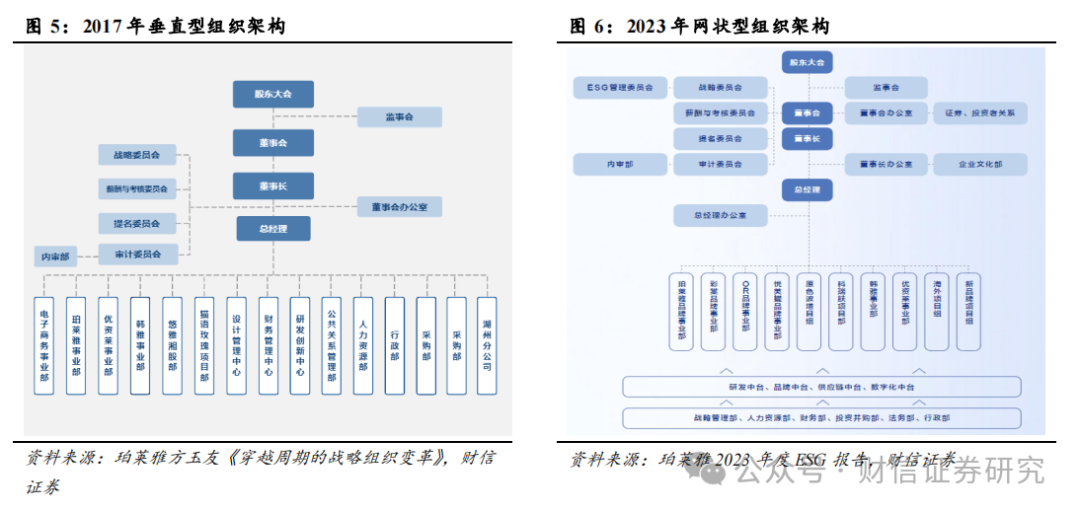 扁平化组织架构灵活高效,能快速响应市场。公司立足“6*N”战略,逐步由专注渠道发展的垂直型组织架构逐步迭代为专注消费者的矩阵型组织架构,组织结构持续优化。矩阵型组织架构不仅搭建了完善的前、中、后台配合模式,还构建了灵活高效的组织运转机制,在实现组织扁平化、平台化、自驱协同的同时,兼顾支撑成熟品牌高效运转,赋能孵化品牌快速成长。