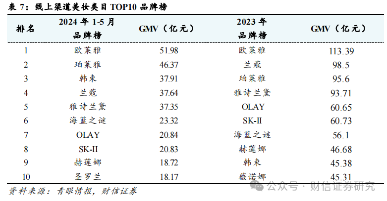 据青眼情报《2023年中国化妆品年鉴》统计,2023年,中国市场国产品牌化妆品市场规模已明显超过外资品牌。其中,国货品牌以50.4%的市场份额,稳居国内化妆品市场的半壁江山,其次分别为欧美、日本、韩国和其他外资品牌。此外,据青眼资讯发布的1-5月线上渠道美妆类目TOP20品牌榜单来看,共有6个国产品牌入围,分别为珀莱雅、韩束、谷雨、自然堂、薇诺娜和欧诗漫,入围品牌个数与2023年持平。其中,珀莱雅、韩束位居榜单第二、第三位,分别较2023年上升1位和6位、同比增速为93.4%和257.7%,增长势头十分强劲。我们猜测主要是在文化自信和理性消费崛起背景下,国货品牌势能持续向上,再叠加产品本身所具备的高性价比,以及线上流量红利,国货品牌快速出圈。
