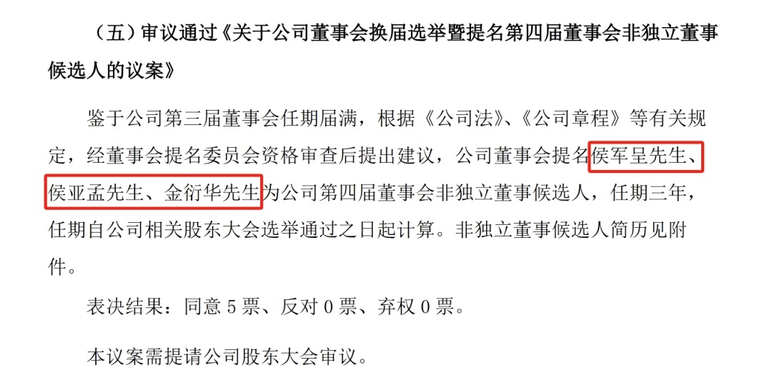 据《公告》披露,鉴于公司(珀莱雅)第三届董事会任期届满,根据《公司法》、《公司章程》等有关规定,经董事会提名委员会资格审查后提出建议,公司董事会提名侯军呈、侯亚孟、金衍华为公司第四届董事会非独立董事候选人,任期三年。不过,上述议案仍有待珀莱雅股东大会审议。