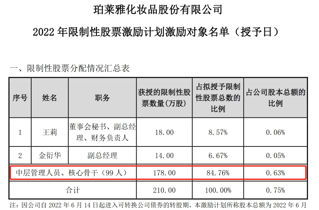 ▍截自《珀莱雅化妆品股份有限公司2022 年限制性股票激励计划激励对象名单》