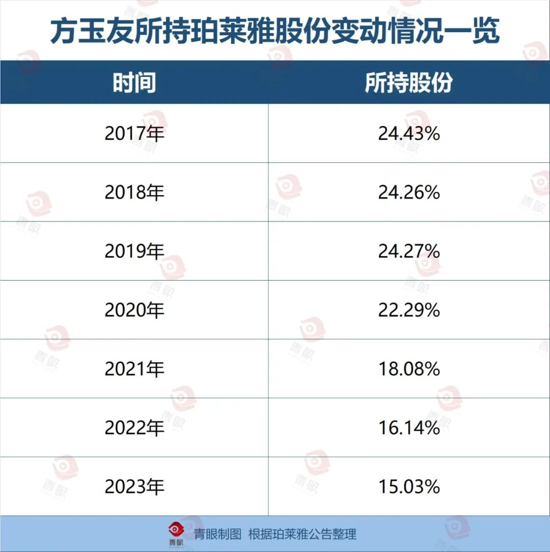 事实上,方玉友将从珀莱雅出走的传闻并未“空穴来风”。据珀莱雅公告显示,自2020年以来,方玉友就频繁减持所持股份。例如,仅2023年一季度,方玉友就减持了7次,目前其所持珀莱雅股份已从上市之初的24.43%降至15.03%,累计套现数十亿元。如此高频次的减持,也让外界对于方玉友与珀莱雅的关系产生疑虑。