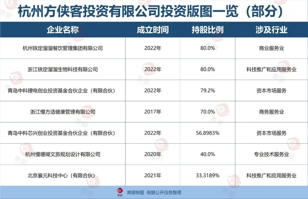 仅2020年至今,方侠客投资公司已投资杭州铁定溜溜餐饮管理集团有限公司、浙江铁定溜溜生物科技有限公司、青岛中科锂电创业投资基金合伙企业(有限合伙)等十余家企业,涵盖商业服务业、科技推广和应用服务业、资本市场服务等多个行业。
