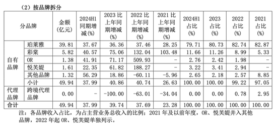 2024年上半年,珀莱雅主品牌收入为39.81亿元,在总营收中的占比为79.71%。近三年珀莱雅主品牌收入贡献均在80%上下。