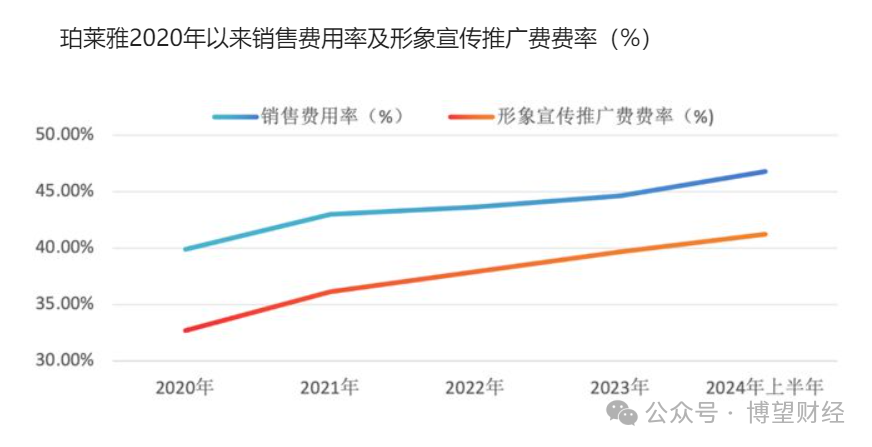 而同期,其销售费用同比增长至23.40亿元,该费用占到营业收入的46.78%,为上市以来同期最高。其中,公司形象宣传推广费逾20亿元,同比增长50.03%。拉长时间蓝,2021年-2023年,珀莱雅形象宣传推广费同比增幅由36%逐渐递增至约46%,均超过各年收入增速。