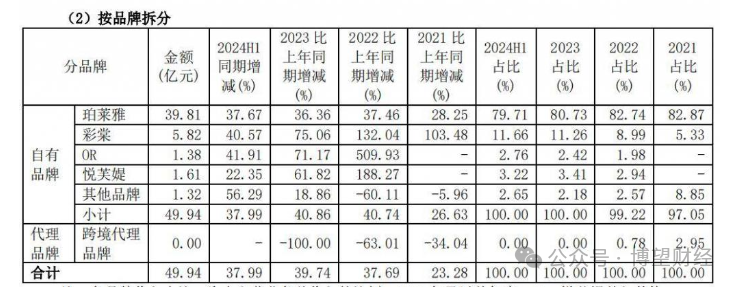 2024 年上半年,珀莱雅实现营收 50.01 亿元,同比增长 37.90%。但其中,主品牌"珀莱雅"营收高达39.81 亿元,贡献了近80%的收入,无疑是公司盈利的架海金梁。