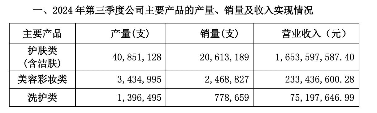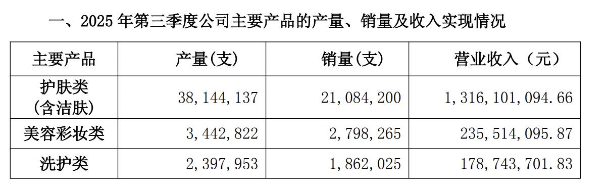 分产品来看,2025年第三季度,珀莱雅护肤类(含洁肤)营业收入为13.16亿元,同比减少20.41%;美容彩妆类营业收入为2.36亿元,同比增长0.89%;洗护类营业收入为1.79亿元,同比增长137.7%。