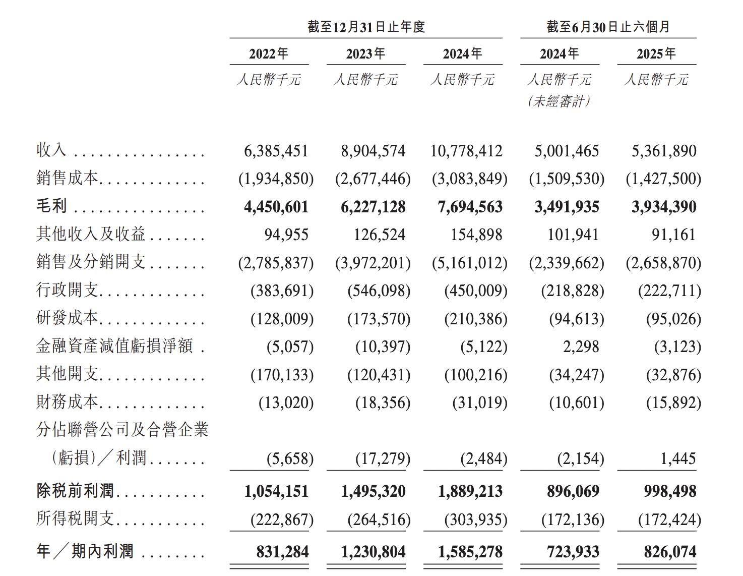 2022年至2024年,珀莱雅收入分别为63.85亿元、89.05亿元、107.78亿元;期内利润分别为8.31亿元、12.31亿元、15.85亿元;毛利率分别为69.7%、69.9%、71.4%。
