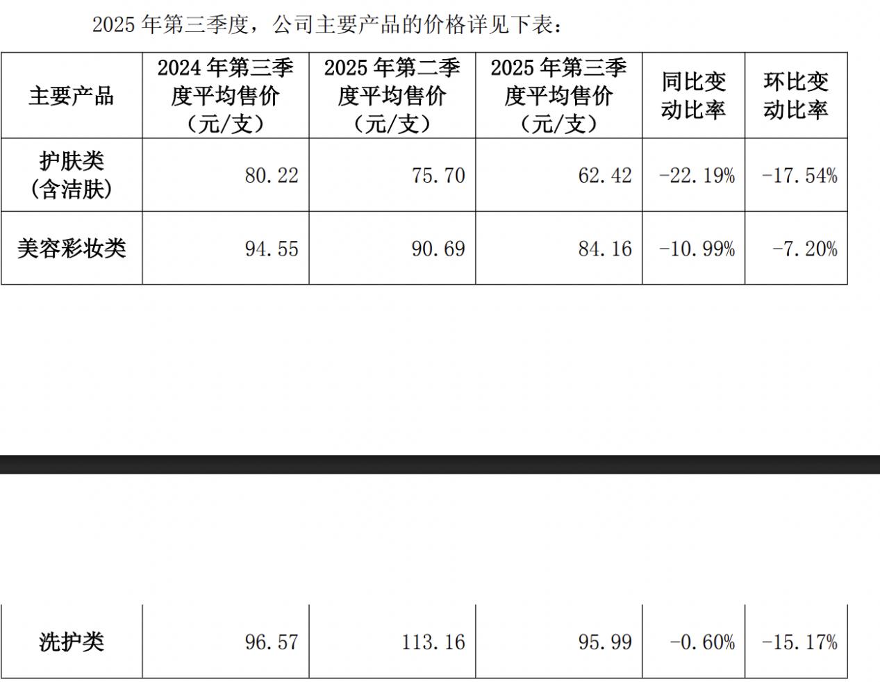 2025年第三季度,珀莱雅护肤类(含洁肤)平均售价62.42元/支,同比减少22.19%,环比减少17.54%,主要系单价较高的大单品(精华、面霜类)销售占比变动所致;美容彩妆类平均售价84.16元/支,同比减少10.99%,环比减少7.2%,主要系美容彩妆类品牌 INSBAHA 销售占比增加,其售价低于美容彩妆类产品平均售价;洗护类平均售价95.99元/支,同比减少0.6%,环比减少15.17%,主要系洗护品牌惊时销售占比增加,惊时售价低于洗护类产品平均售价,以及促销力度增加。