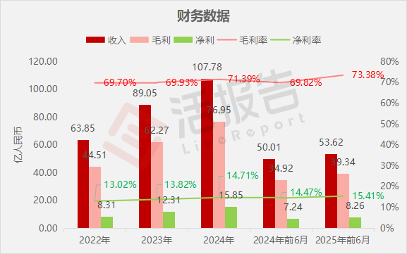 收入分别约为人民币63.85亿、89.05亿、107.78亿、50.01亿、53.62亿,2025年前6月同比+7.21%;