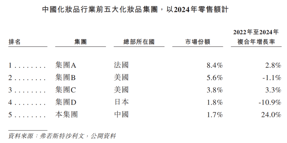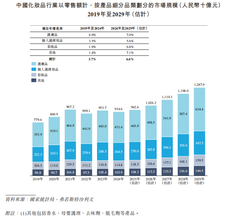 根据弗若斯特沙利文(Frost & Sullivan)报告,中国是全球第二大化妆品市场,2024年市场规模达人民币9346亿元,占全球份额约11.4%;2024-2029年市场将以6.6%的复合年增长率增长,预计2029年达12879亿元,增速约为全球两倍。