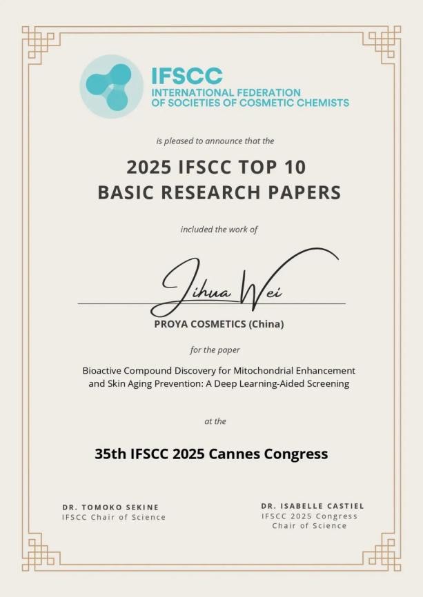 在AI技术辅助下,珀莱雅研发团队成功筛选出具有增强线粒体功能、实现抗皱紧致功效的活性化合物,并开发出前沿复合配方,已应用于“能量系列2.0”产品中。凭借该突破性成果,珀莱雅荣获有化妆品界“诺贝尔奖”之称的“2025 IFSCC十大基础研究奖”,成为IFSCC历史上唯一获此殊荣的中国化妆品企业。