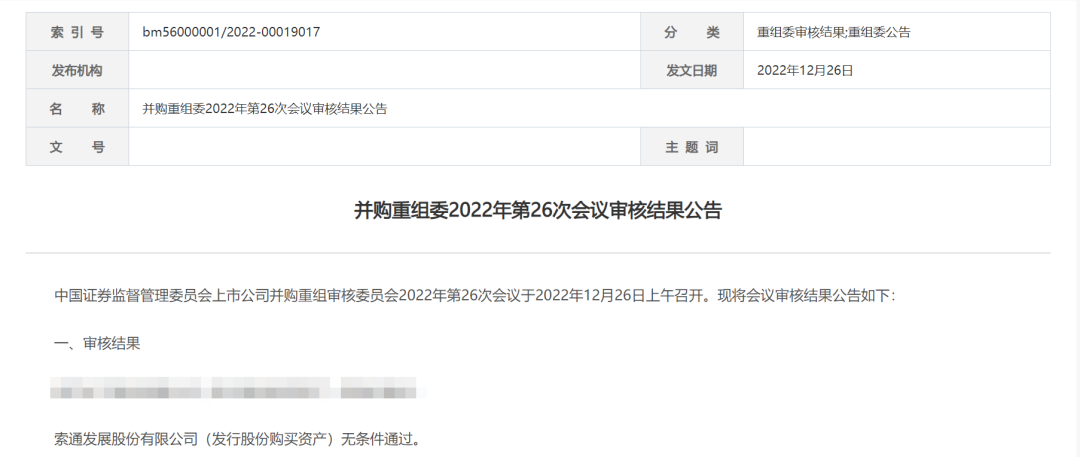 12月26日,中国证券监督管理委员会上市公司并购重组审核委员会召开2022年第26次并购重组委工作会议,对索通发展股份有限公司发行股份及支付现金购买资产并募集配套资金暨关联交易事项进行了审核。根据会议审议结果,公司本次重组事项获得无条件通过。