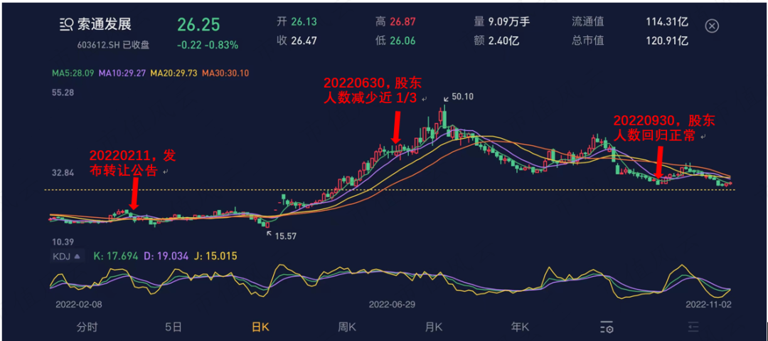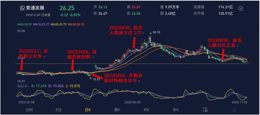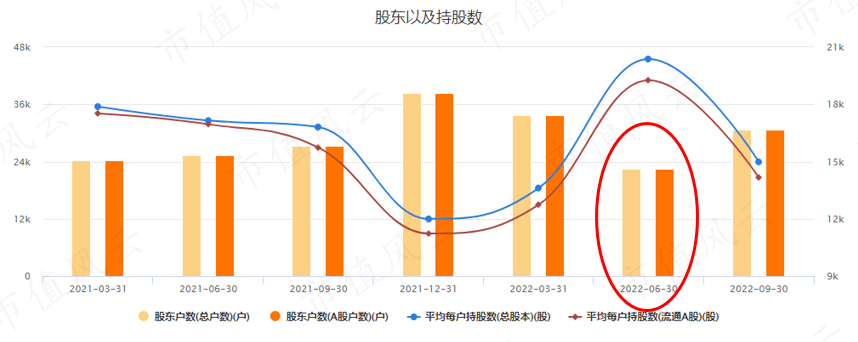 到2022年三季度末,索通发展的股价经历两波涨幅,股东人数涨至30,742户,基本回归历史平均规模。