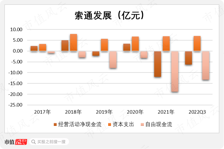 特别是2021年以来,索通发展业绩大增,但经营活动现金流反而因为原材料价格上涨、备货增加,转为流出;2021年、2022年前三季度分别为-11.93亿元、-6.23亿元。