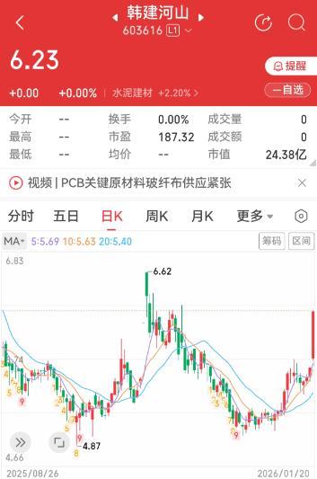 然而,在发布重组公告前的1月20日,也就是签署意向协议的当天,韩建河山股价高开高走,开盘不到半小时即斩获涨停板。截至当天收盘,韩建河山收于涨停,报6.23元/股,最新市值约24亿元,全天成交额2.09亿元,较前一日放量逾1.1亿元。