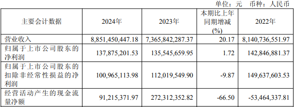 2024年,杭电股份实现营业收入88.51亿元,同比增长20.17%;归属于上市公司股东的净利润1.38亿元,同比增长1.72%;归属于上市公司股东的扣除非经常性损益的净利润1.01亿元,同比减少9.87%;经营活动产生的现金流量净额9121.54万元,同比减少66.50%。