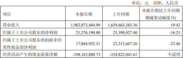 2025年第一季度,公司实现营业收入为19.82亿元,同比增长19.43%;归属于上市公司股东的净利润2127.62万元,同比减少16.23%;归属于上市公司股东的扣除非经常性损益的净利润1784.50万元,同比减少23.46%;经营活动产生的现金流量净额-1.98亿元,上年同期为-3.35亿元。