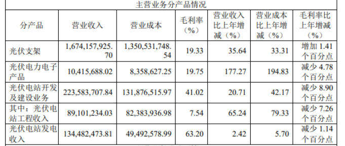 光伏电力电子产品毛利率19.75%,同比减少4.78个百分点;光伏电站开发及建设业务毛利率减少8.9个百分点至41.02%。虽然上述板块收入占比小,但是毛利率下滑幅度大,致使整体产品毛利率减少了0.23个百分点。