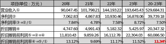 20-23年调增折旧摊销后的折旧摊销前利润率测算见下表,改按20-23年综合平均折旧摊销前利润率11.34%来测算,收入复合增长率仍按发行人采用的23.88%,“未来三年预计自身经营利润积累”的资金将为102,684.29万【193,645.43*(1.2388+1.23882+1.23883)*11.34%】,共增加39,698.88万。