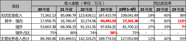 发行人历年营业收入主要来源于光伏支架,20年-23年,来源于光伏支架的主营业务收入分别为71,562.13万、85,086.79万、123,426.11万、167,415.79万,占主营业务收入的比例分别为80.06%、84.69%、86.72%、88.22%,占比高且呈上升趋势。该产品以外销境外为主,20年、21年、22年、23年1-9月境外收入占比分别为75%、80%、74%、75%,较稳定,但23年全年此产品境外收入占比突然下降至58%,主要由于四季度境内收入突增至42,140.18万,为前三季度合计境内收入的1.54倍。