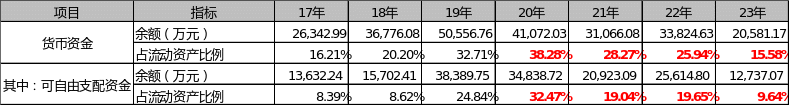 发行人货币资金占流动资产比例从17年16.21%逐步提高,20年38.28%为高点,近几年逐步降低到23年的15.58%。若扣除受限部分,可自由支配资金占流动资产比例则从20年的32.47%下降到23年仅9.64%,可自由支配资金金额已为上市以来最低,仅12,737.07万。