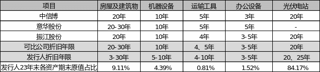 再来看下折旧年限的设置情况,经将发行人折旧年限与可比上市公司折旧年限比较,可发现发行人折旧年限的设置相较来说是更高的。比如发行人价值最大的固定资产为光伏电站,占比84.17%,折旧年限设置为20年或者25年,但可比上市公司均为20年;对于运输设备,发行人折旧年限为4-10年,但可比上市公司为4年或者5年。