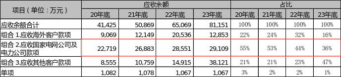 发行人应收余额主要可分为三类组合,其中组合1应收海外客户款项应收余额除22年底超2亿外其他年份在1亿左右,组合3应收其他客户款项的应收余额在20-22年期间逐步增加至1.5亿,23年末则受23年四季度收入突增影响增加至3.8亿,而组合2应收国家电网公司及电力公司款项金额则一直较大,20-23年末金额分别为22,719万、26,883万、28,551万、29,109万,其中超98%为应收可再生能源补贴款。