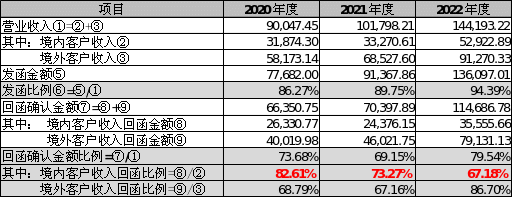 另关于境内营业收入,有一个异常现象:发行人在本次再融资监管问询函回复中提到,20-22年,收入发函比例分别为86.27%、89.75%、94.39%,逐年提高,整体回函确认金额比例也有提高,从73.68%提高至79.54%,但拆分结构后,可以发现主要是境外客户收入回函确认比例由68.79%大幅提高至86.7%,境内客户收入回函确认比例在这3年实际是逐步下降的,由20年的82.61%下降至了22年的67.18%,而同属于募集说明书报告期的23年1-9月份函证情况未见提及。估值之家查阅到其他上市公司再融资项目是有披露非整个年度函证情况的,也就是说23年1-9月收入本身是可以函证且披露的。