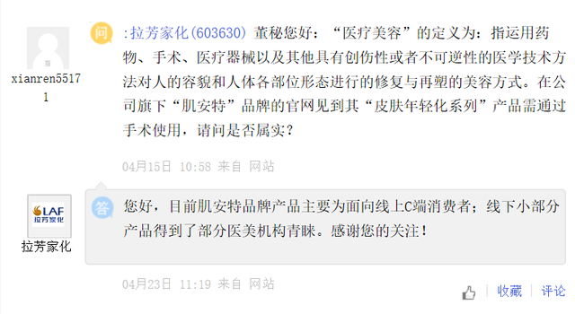 近来拉芳家化被认为开始布局医美业务。4月23日,拉芳家化在投资者互动平台回答问题时披露,旗下部分产品得到医美机构青睐。在5月16日,拉芳又签订协议,认购了医美国际集团7%的股权。