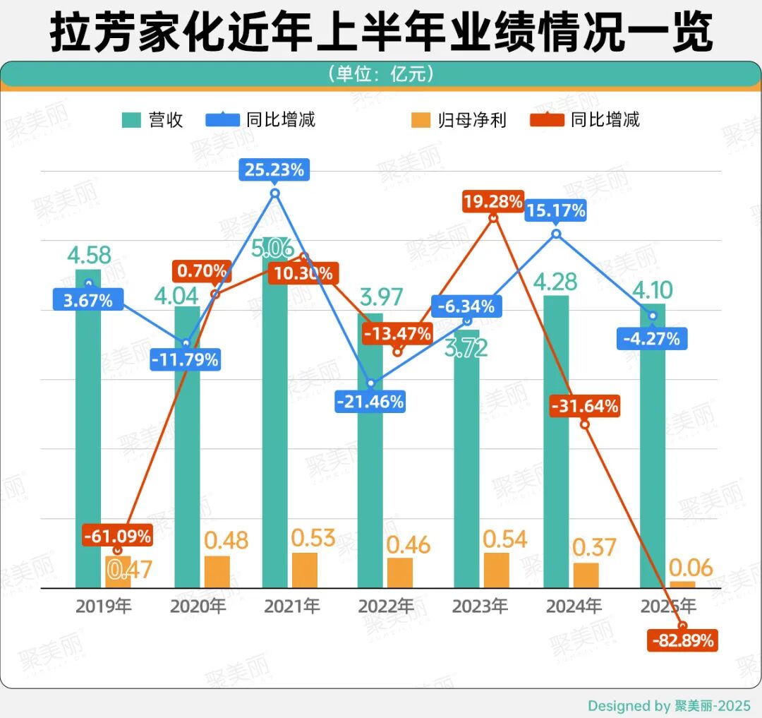 8月27晚间,老牌日化企业拉芳家化股份有限公司(以下简称“拉芳家化”)公布了2025年上半年业绩报告。本报告期内,拉芳家化的业绩大幅下滑,营收与净利双双下降。