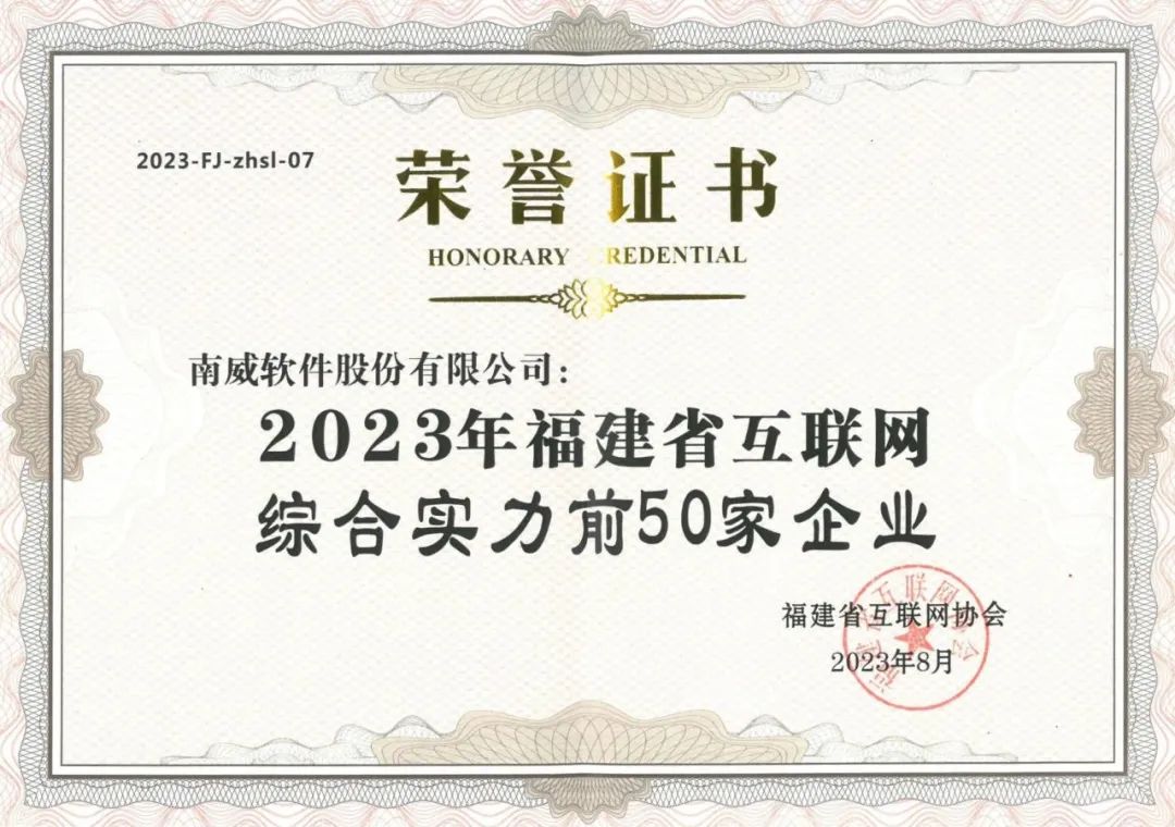 “2023年福建省互联网综合实力前50家企业”获奖证书