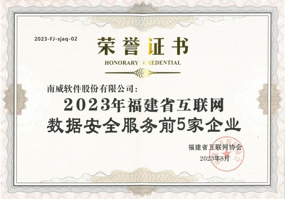 “2023年福建省互联网数据安全服务前5家企业”获奖证书