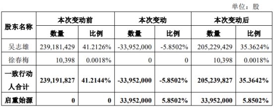 本次协议转让前,吴志雄及其一致行动人徐春梅合计共持有公司239,191,827股,占公司总股本的41.2144%。本次协议转让后,吴志雄及其一致行动人合计共持有公司205,239,827股,占公司总股本的35.3642%。启重始源将持有公司33,952,000股股份,占公司总股本的5.8502%,吴志雄仍是公司控股股东、实际控制人。