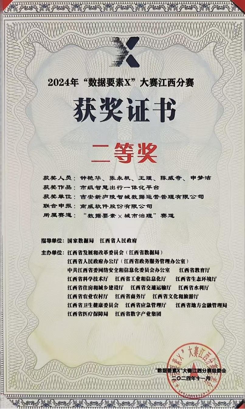 近期,由国家数据局、江西省人民政府指导,江西省数据局、江西省人民政府办公厅等单位主办的2024年“数据要素×”大赛江西分赛落下帷幕,南威软件集团携手吉安新庐陵智城数据运营管理有限公司打造的“吉安市智慧出行一体化平台”荣获本次大赛城市治理赛道二等奖。