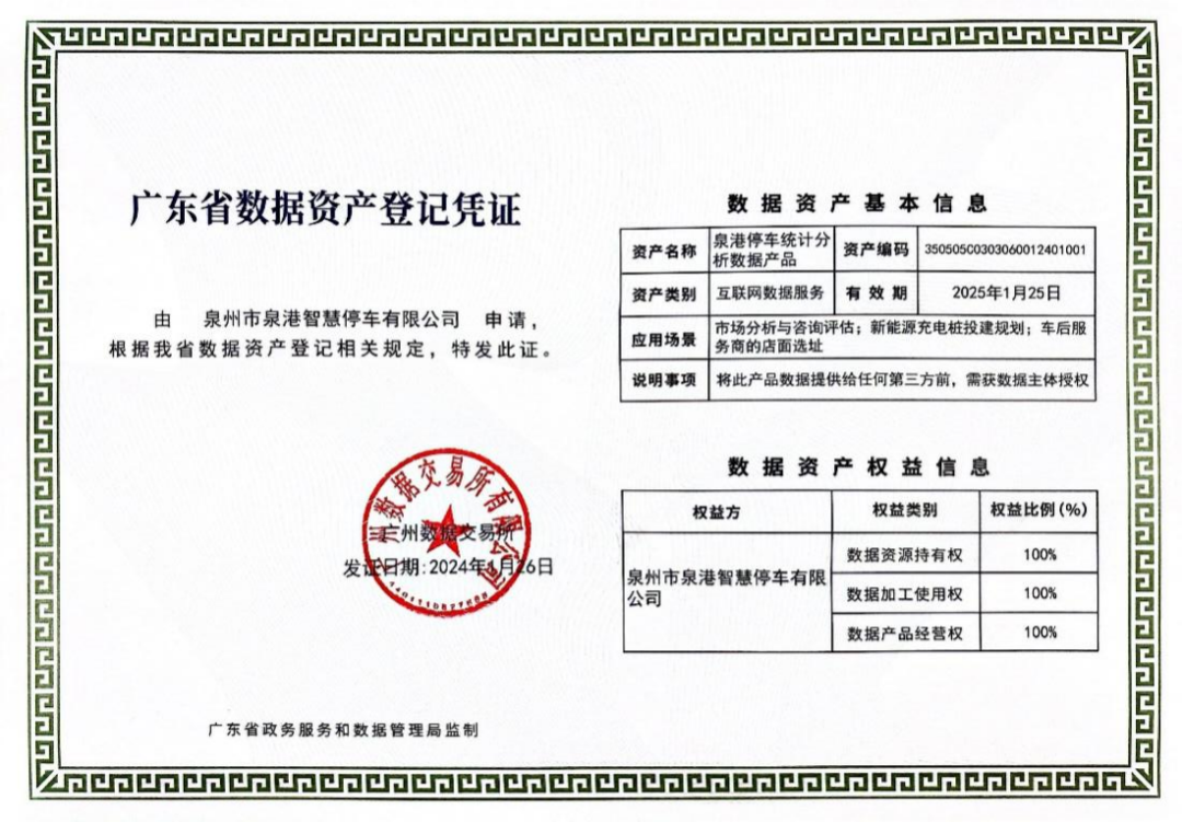 南威软件集团基于多年项目实践经验,形成停车数据要素业务挖掘能力,停车项目覆盖太仓市、德阳市、吉安市、漳州市、福州市、三明市、厦门市、泉港区等城市级、物业级智慧停车项目,服务超百万车主用户。南威软件集团打造的停车实时空位数据及泉港停车统计分析数据产品于2024年初在广州数据交易所正式挂牌,并取得广东省数据资产登记凭证。同时,南威软件集团“城市级停车数据要素运营方案”凭借优秀的行业示范性和强大的市场潜力荣获2024年数字中国创新大赛数据要素X赛道全国三等奖。